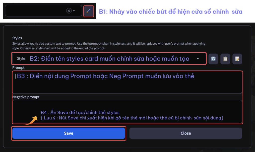 • Styles card : Là chức năng có sẵn của Automatic1111 giúp người dùng có thể lưu trữ các mẫu prompt thành các thẻ riêng biệt và có thể dễ dàng gọi và kết hợp với các thẻ khác