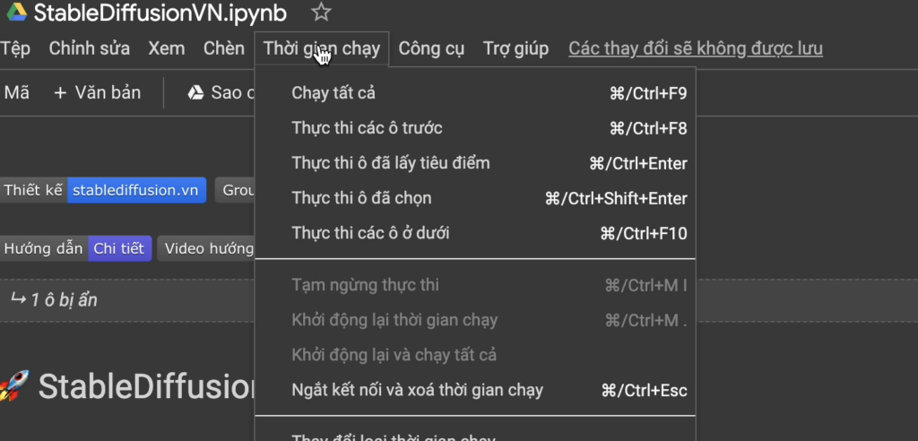 1.4 Nên ngắt phiên làm việc ở google colab sau mỗi lần sử dụng để tránh lãng phí tài nguyên,vào “Thời gian chạy” => “Ngắt kết nối và xoá thời gian chạy”