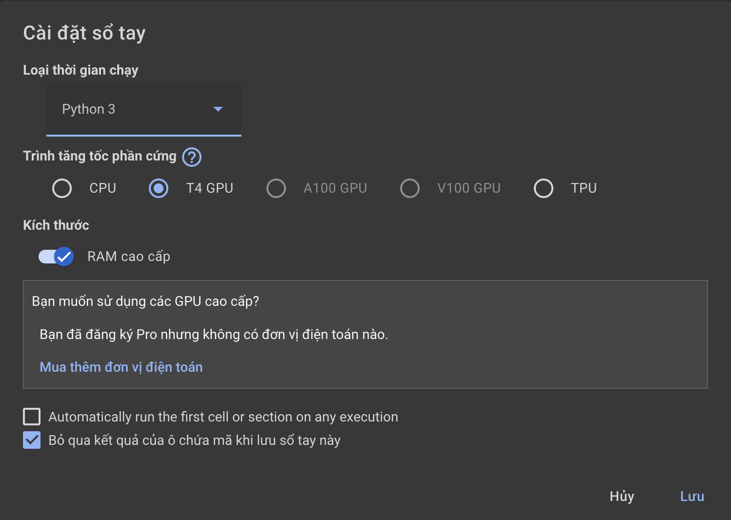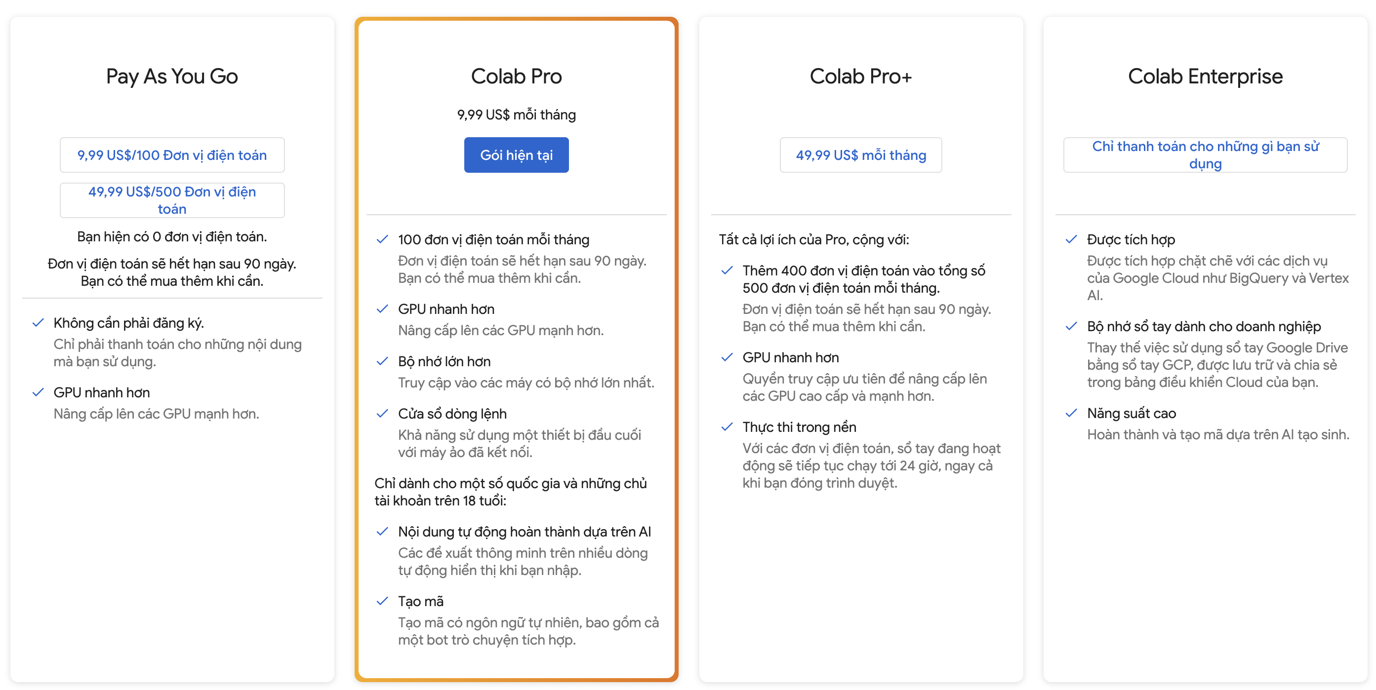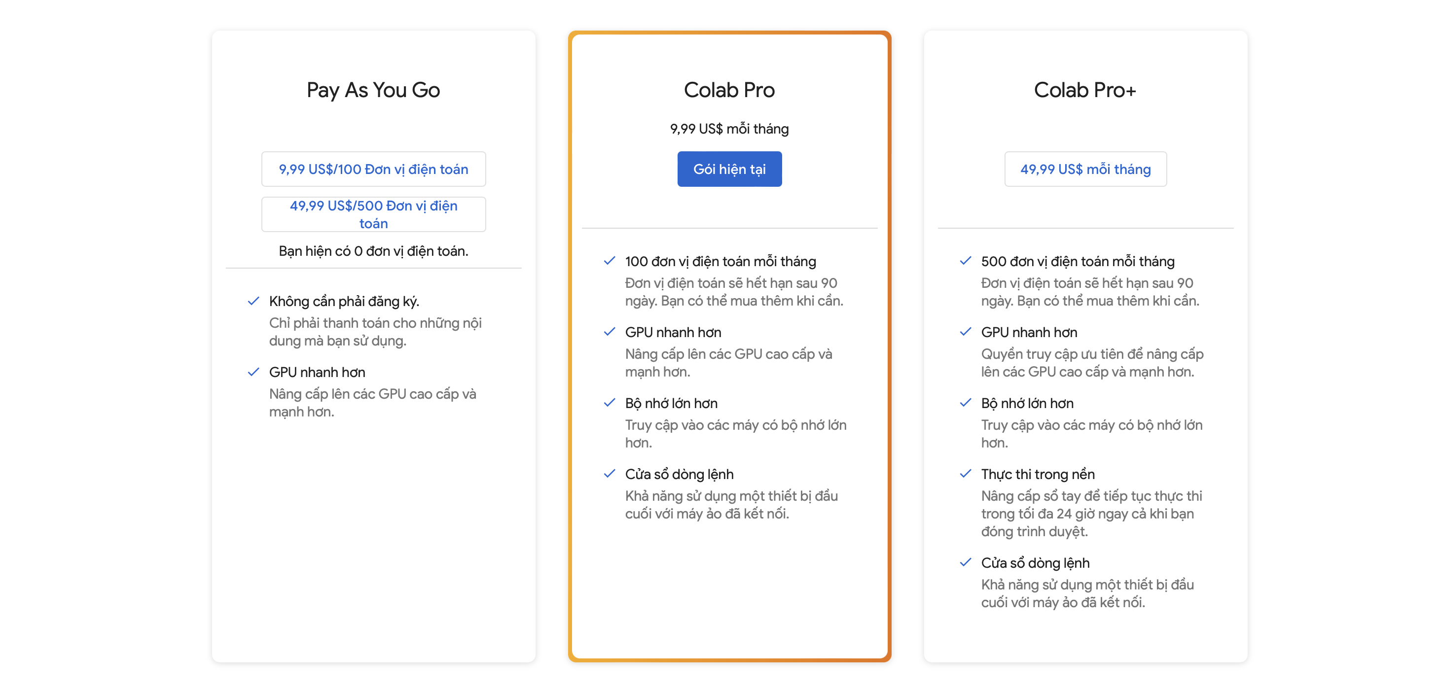 – Lưu ý với gói google colab pro : 100 đơn vị điện toán được quy đổi tương đương 50h sử dụng GPU, hết điện toán thì tài khoản pro chỉ còn tác dụng là sử dụng với bộ nhớ RAM lớn hơn ( 25G ) , bộ nhớ ổ cứng lớn hơn ( 170G ) , thời gian sử dụng free trong ngày cũng được nhiều hơn.